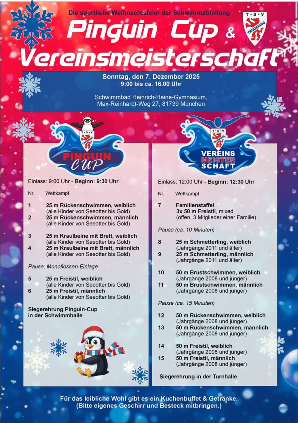 Am 7. Dezember 2025 ist es wieder so weit: Die Schwimmabteilung des TSV Trudering e.V. lädt zur 3. vereinsinternen Schwimmmeisterschaft inklusive Pinguin-Cup ein.