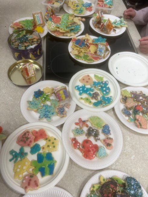 Jeweils fünfzehn Kinder tauschten Wasser und Schwimmbrett gegen Nudelhölzer und Ausstechförmchen. Mit viel Geduld kneteten, rollten, stachen sie Teige aus und dekorierten ihre Werke. Alle arbeiteten konzentriert an ihren Tannenbäumen und Sternen. Natürlich wurde zwischendurch genascht, sodass bunte Streusel nicht nur an den Fingern, sondern auch im Gesicht klebten und der Zuckerguss die Zungen bunt verfärbte. Nach zwei Stunden Weihnachtsbäckerei duftete alles nach Vanille und frisch gebackenen Keksen. Glücklich und stolz trugen die Kinder ihre „Beute“ nach Hause.