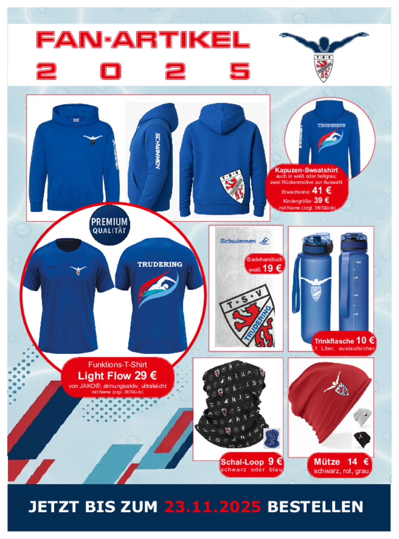 Liebe Schwimmerinnen und Schwimmer, wir freuen uns Euch unser erweitertes Merchandise der Schwimmabteilung zu präsentieren.